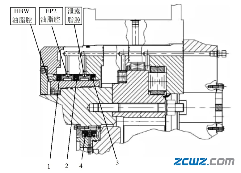 图中所示为其刀盘驱动系统的密封结构。该盾构机由内外两层密封结构组成,其中外密封由三道唇形密封组成,第一道唇形密封与密封压紧环之间形成的油脂腔采用黏度较大的HBW进行密封和润滑,将土舱内泥水与主驱动内部密封腔隔离;第二道密封与第一道密封之间的油脂腔采用黏度相对较小的EP2油脂进行润滑;在第三道密封与第二道密封之间的油脂腔为润滑油腔,外接一个防泄漏油箱,用来收集泄漏油脂并检测密封的磨损情况。内密封采用双唇形密封,将主轴承与隧道内的空气隔离,双唇之间采用手动方式供给EP2油脂,润滑唇口,降低摩擦。