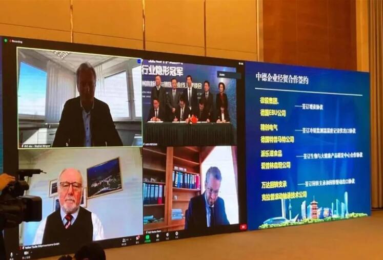 活动现场,徐州高新区和德国隐形冠军企业协会在会上达成战略合作协议,“徐州高新区驻欧洲经贸代表处”成功揭牌,徐锻集团和德国EBU公司签订增资协议,精创电气和德国特普马特公司签订冷链检测温湿度记录仪出口协议,派乐滋食品与爱普林斯坦签订共建生物与大健康产品研发中心合作协议,万达回转支承与克拉普滚动轴承技术公司签订出口协议,4家德国企业通过网上连线签订意向投资协议。