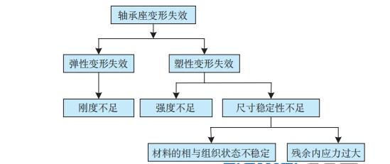 轴承座的变形失效可分为弹性变形失效和塑性变形失效两种情况。前者是指由于轴承座的刚度不足,工作过程中发生了过大的弹性变形,影响了轴承座的支撑、定位功能,引起发动机转子系统工作异常;后者是指由于发生了过大的塑性变形而造成轴承座的失效。根据轴承座塑性变形的产生原因,又存在两种失效情况,一种是由于轴承座强度不足,导致工作状态下的应力水平超过了轴承座材料的屈服强度;另一种是由于轴承座的尺寸稳定性不足,使零件在恒定或非恒定环境下发生了尺寸或形位的微小不可逆变化。